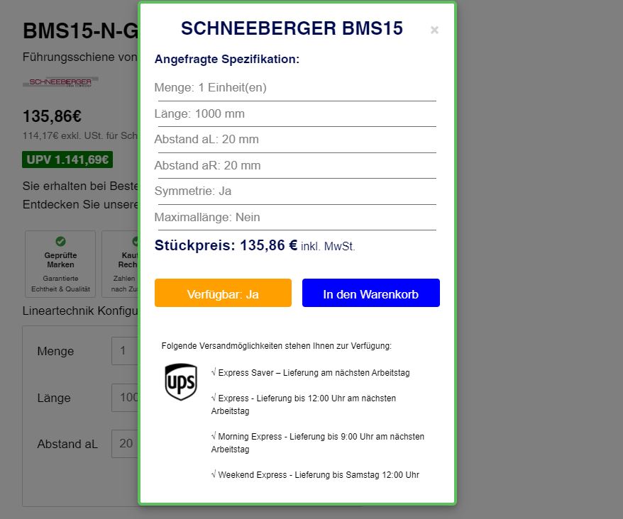 Im dritten Schritt können Sie das Produkt mit der gewünschten Länge in Ihren Warenkorb ablegen. Im Warenkorb finden Sie Angaben über alle ausgewählten INA Produkte, der Stückzahl, den jeweiligen Preis. Sofern wir eine Konfiguration entgegen unserer Shop Angaben nicht ab Lager haben, werden wir alles unternehmen, um Ihnen schnellstmöglich ein Angebot zu einem unserer ähnlichen INA Produkte zukommen zu lassen.